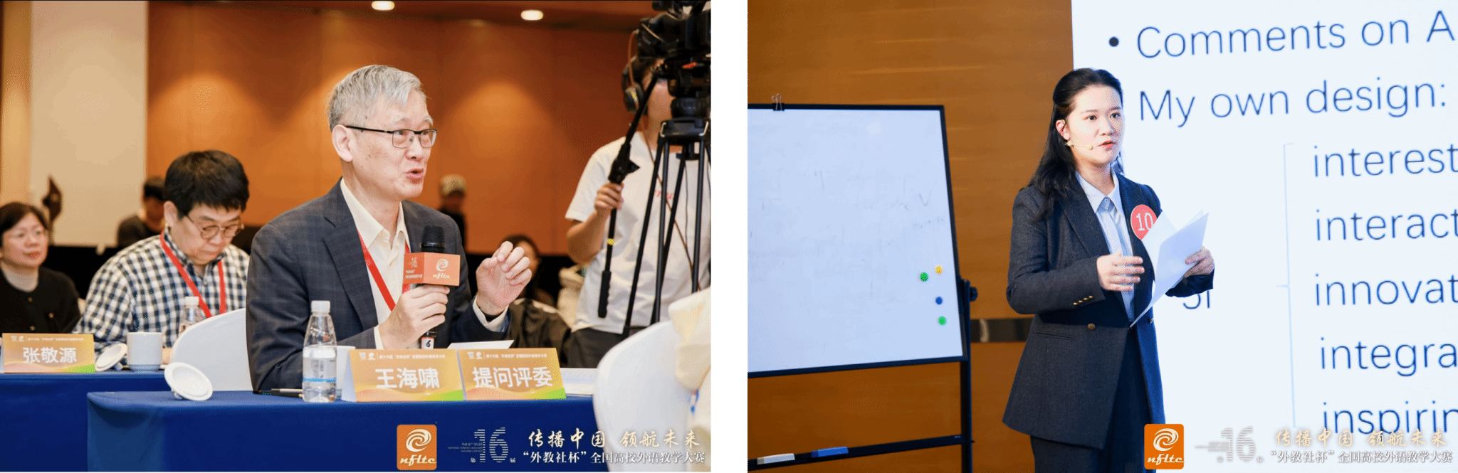 本届教学大赛分为综合课组和视听说课组,采用“线下授课+说课”相结合的形式,从全国三十个赛区脱颖而出的省赛冠军教师同台竞技,比拼教学育人素养,集中展现高校外语教学的前沿实践。决赛环节要求选手依托自备备课资料现场授课并回应评委提问,重点考察课堂设计的实操性与教学功底;总决赛则创新性引入“AI 撰写教案”素材,要求入围选手在30分钟内完成视频内容解读、AI教案评价与个性化教学设计,随后进行10分钟说课及5分钟评委互动问答,凸显了“技术融合、思辨创新、立德树人”的高校外语教学发展导向。